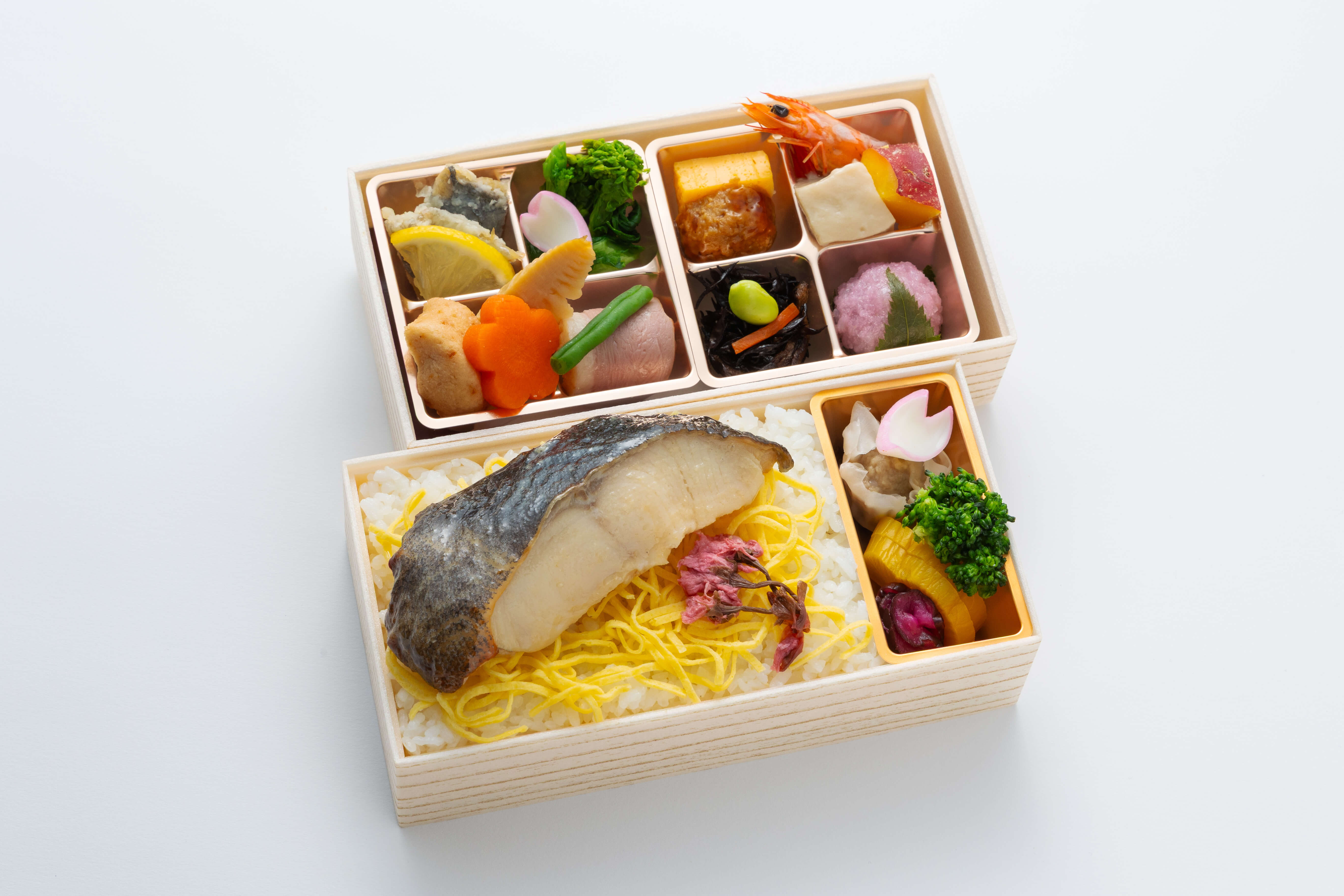 ふっくらと焼き上げた銀ダラの西京焼きを主役に、春の彩りを添えた二段重。やさしい味噌の香りと旬のおかずが、晴れの席を穏やかに彩ります。